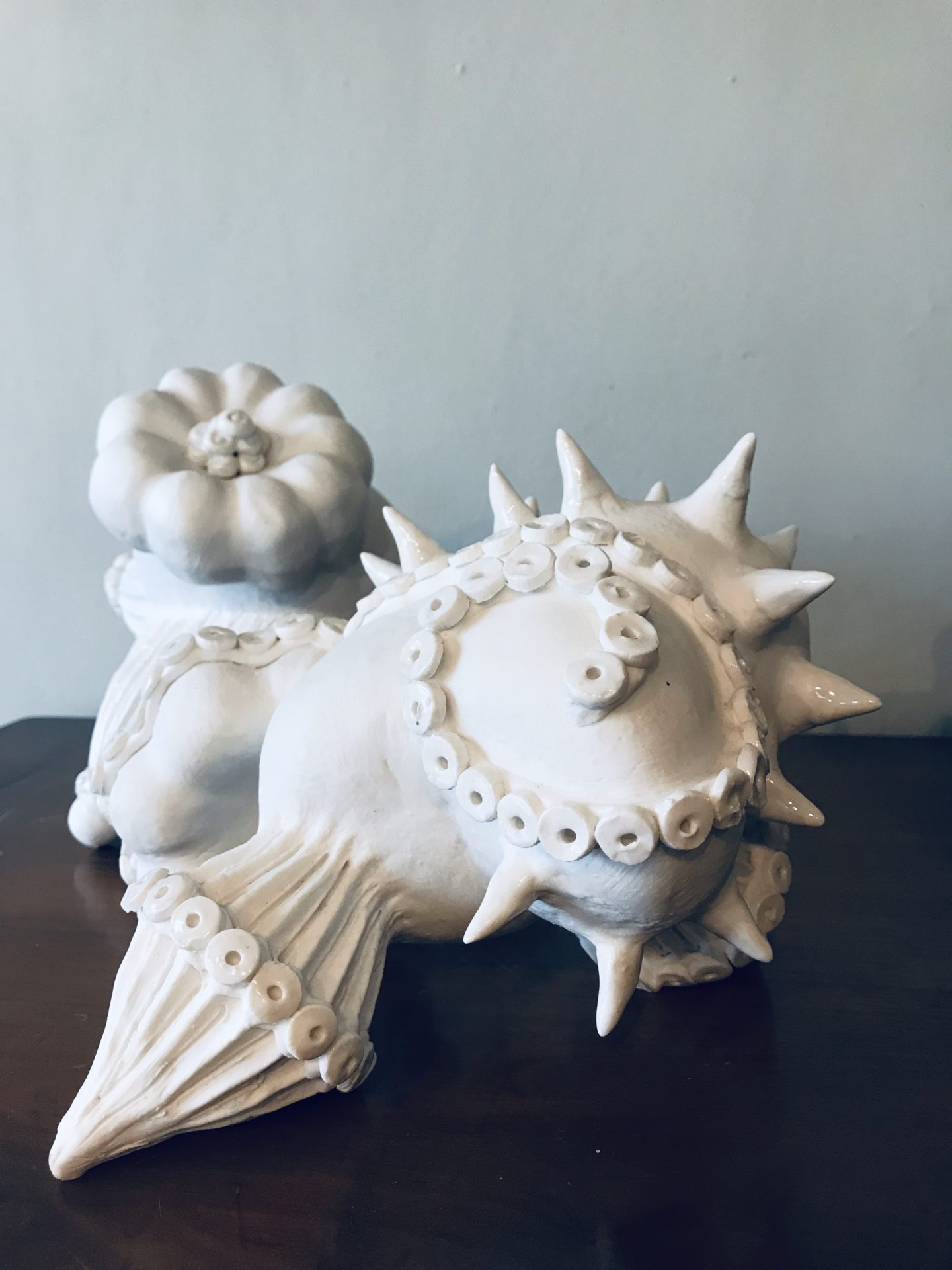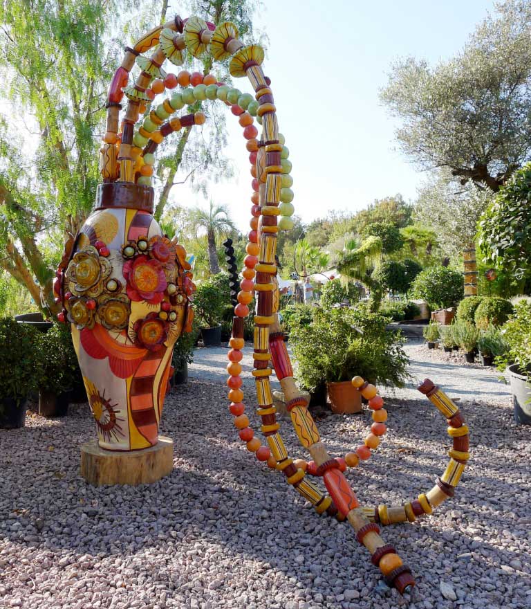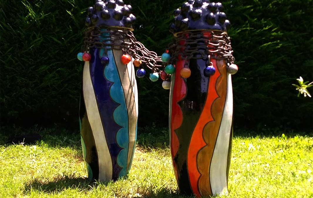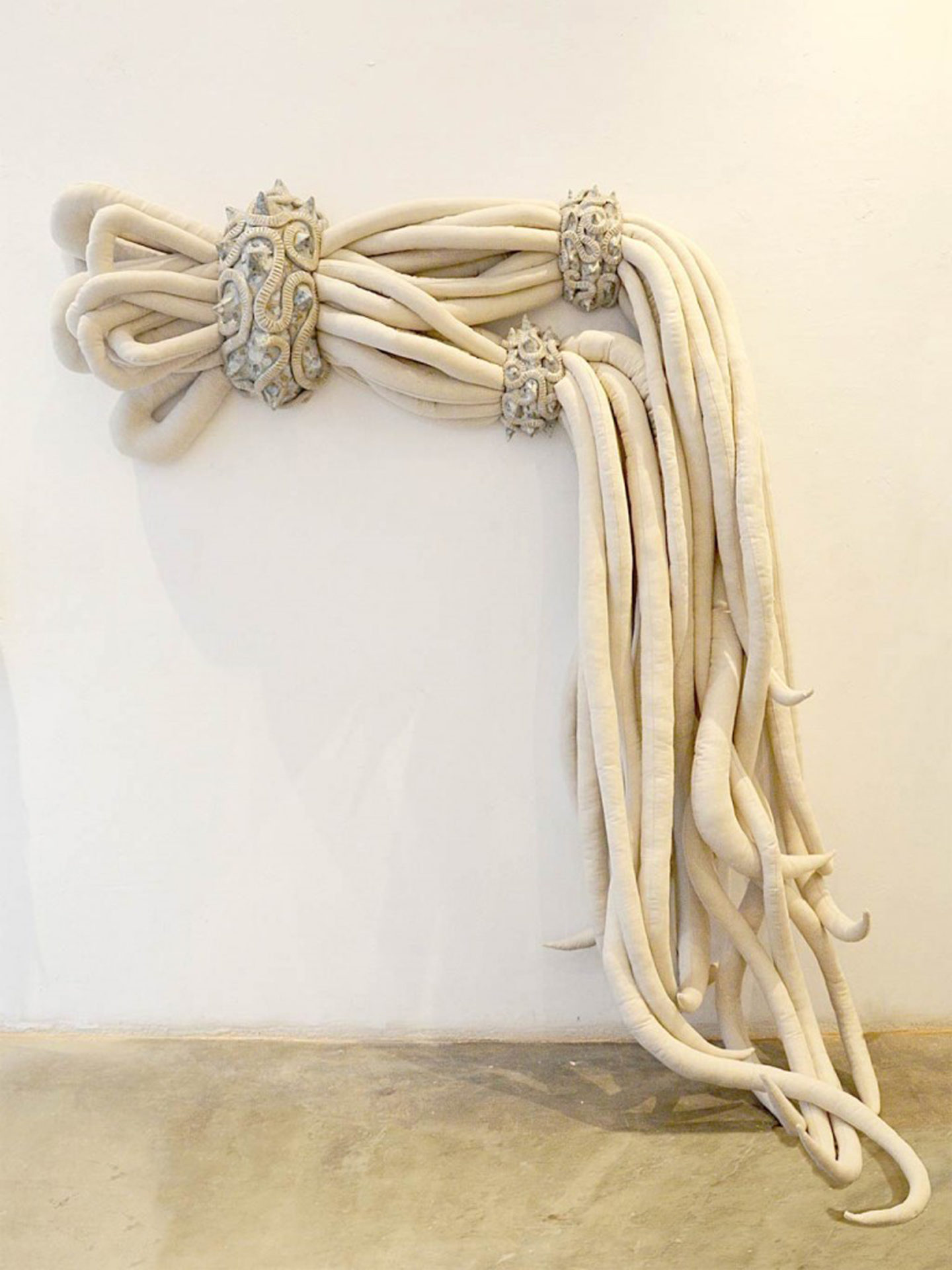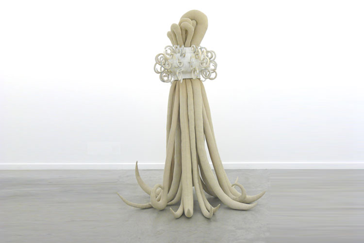 Dans « Parures » et « Tripodes » où ses grandes sculptures à trois pieds en textile rembourré et en céramique, suggèrent des pièces de jeu d’échecs dressées sur la pointe des pieds, ou des jarres de jardin qui auraient tourné drag queen des beaux quartiers.