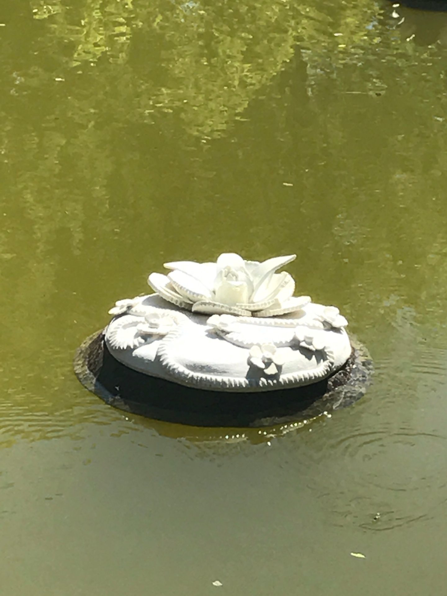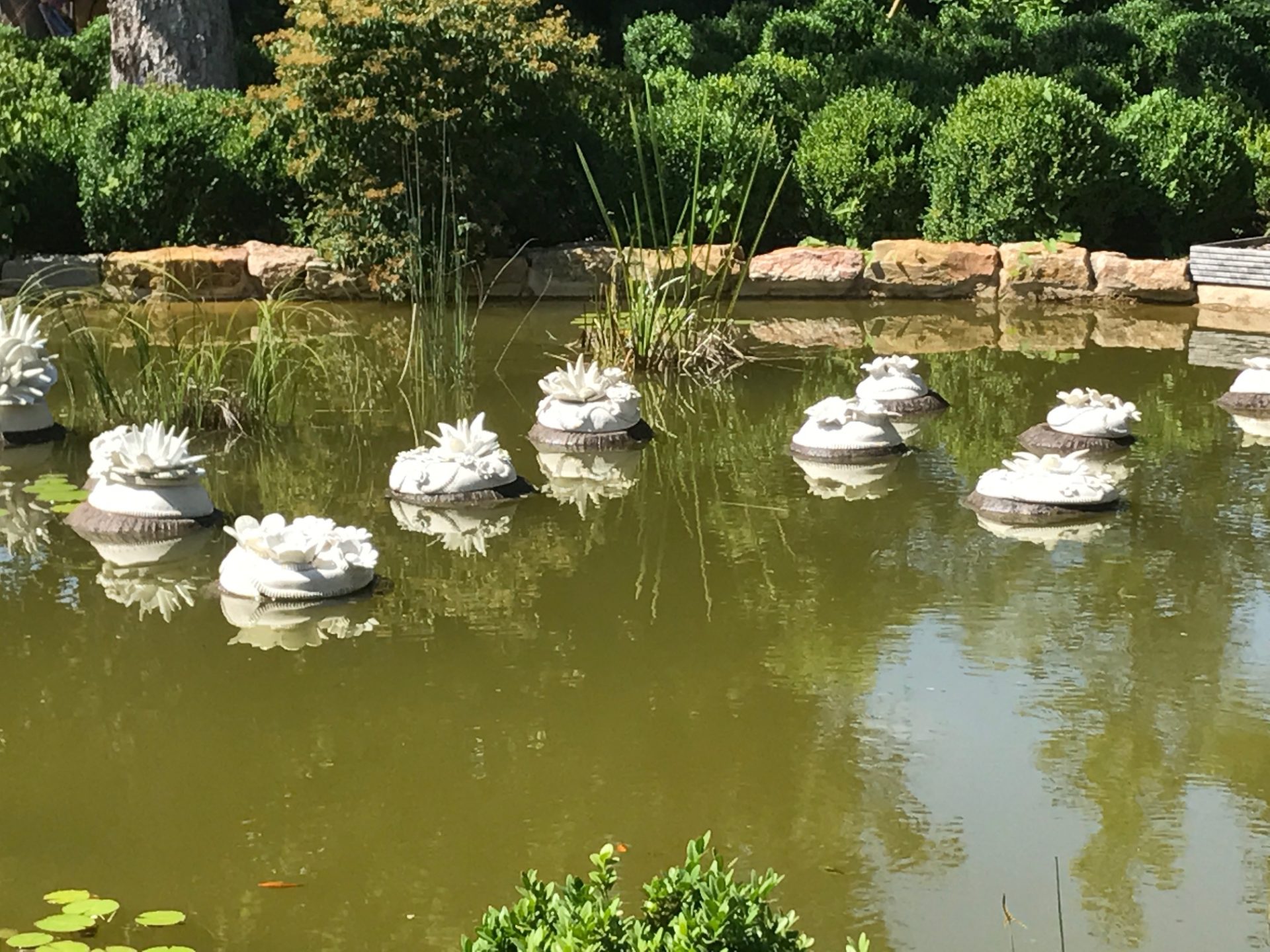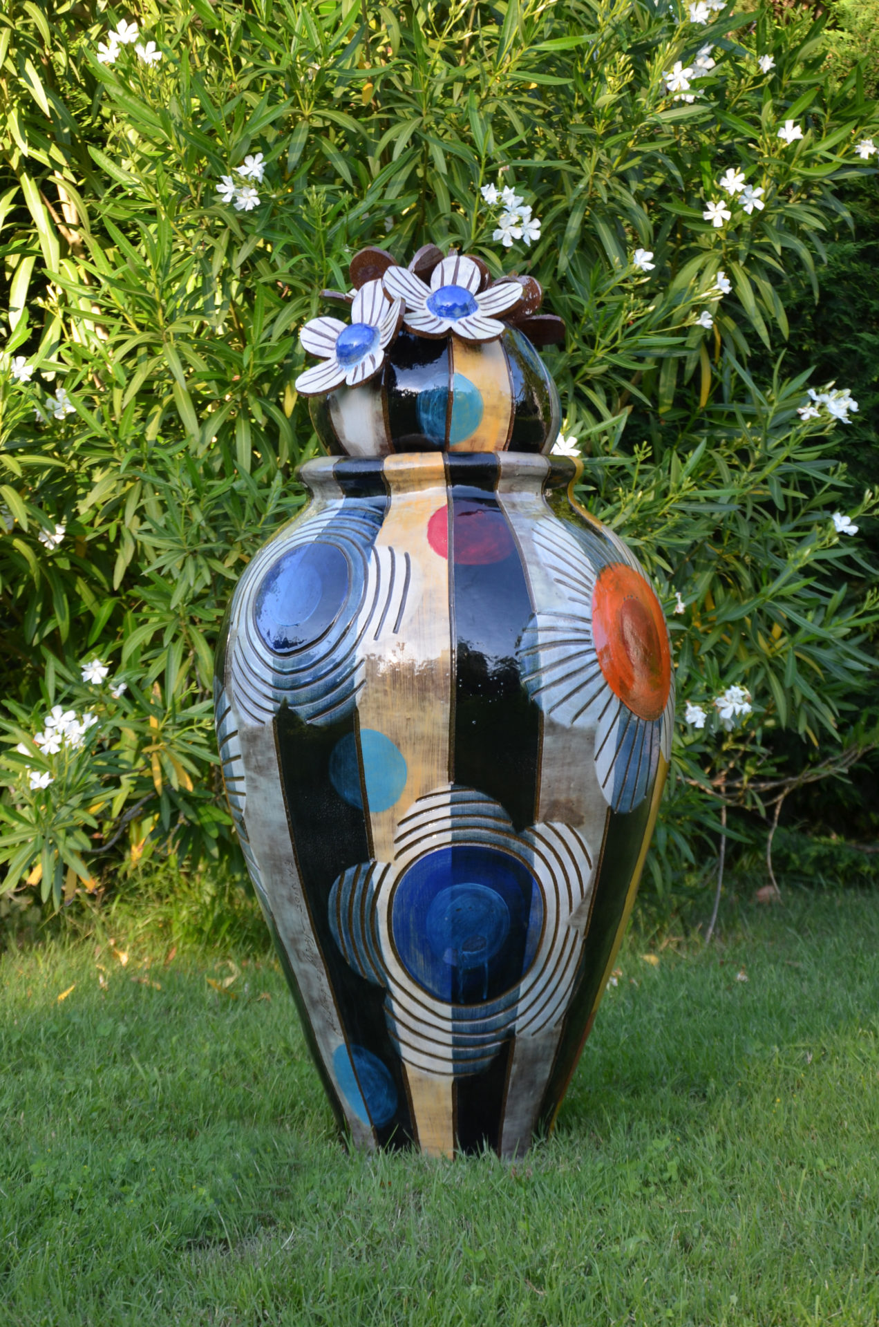 Dans « Parures » et « Tripodes » où ses grandes sculptures à trois pieds en textile rembourré et en céramique, suggèrent des pièces de jeu d’échecs dressées sur la pointe des pieds, ou des jarres de jardin qui auraient tourné drag queen des beaux quartiers.