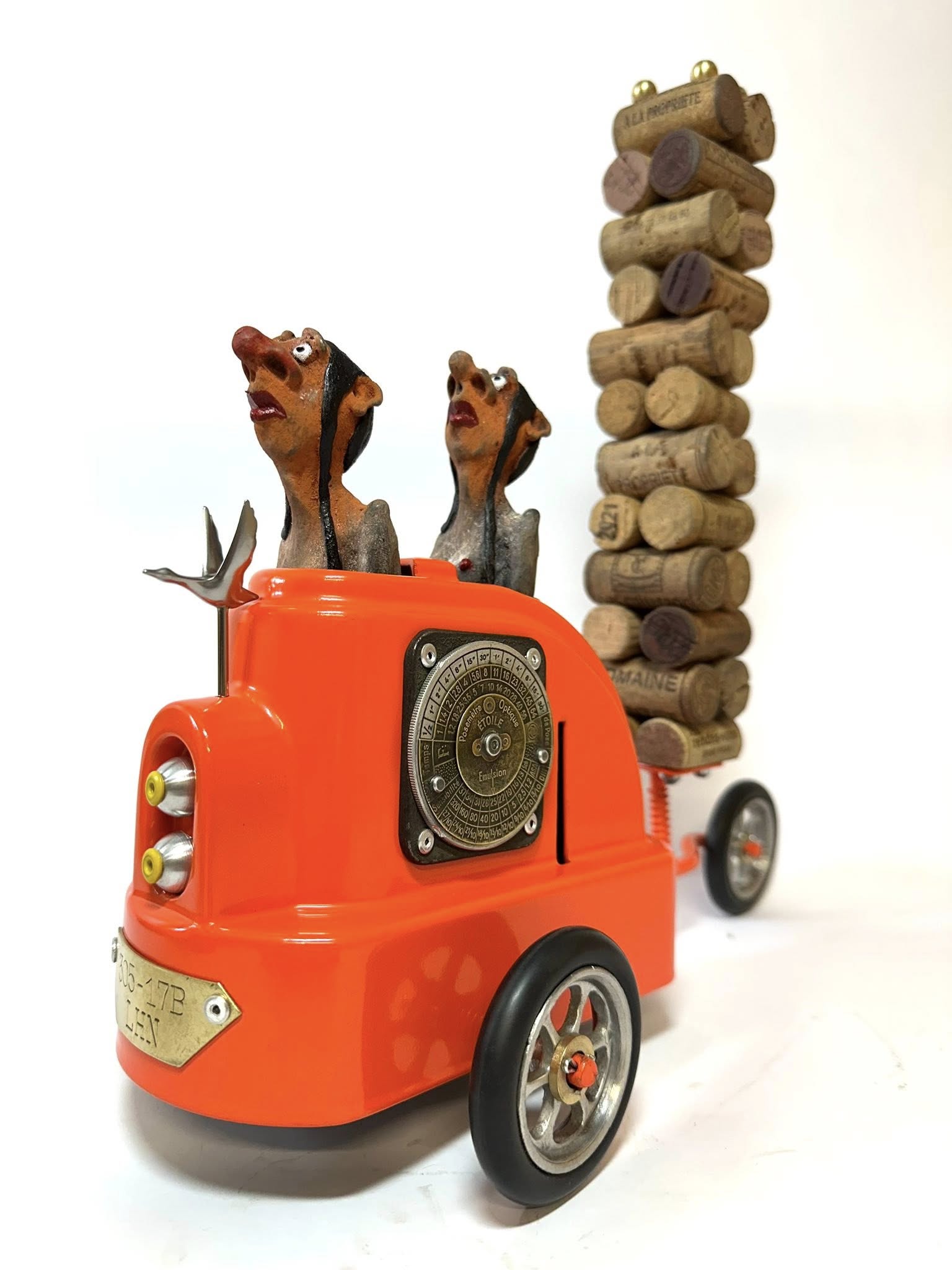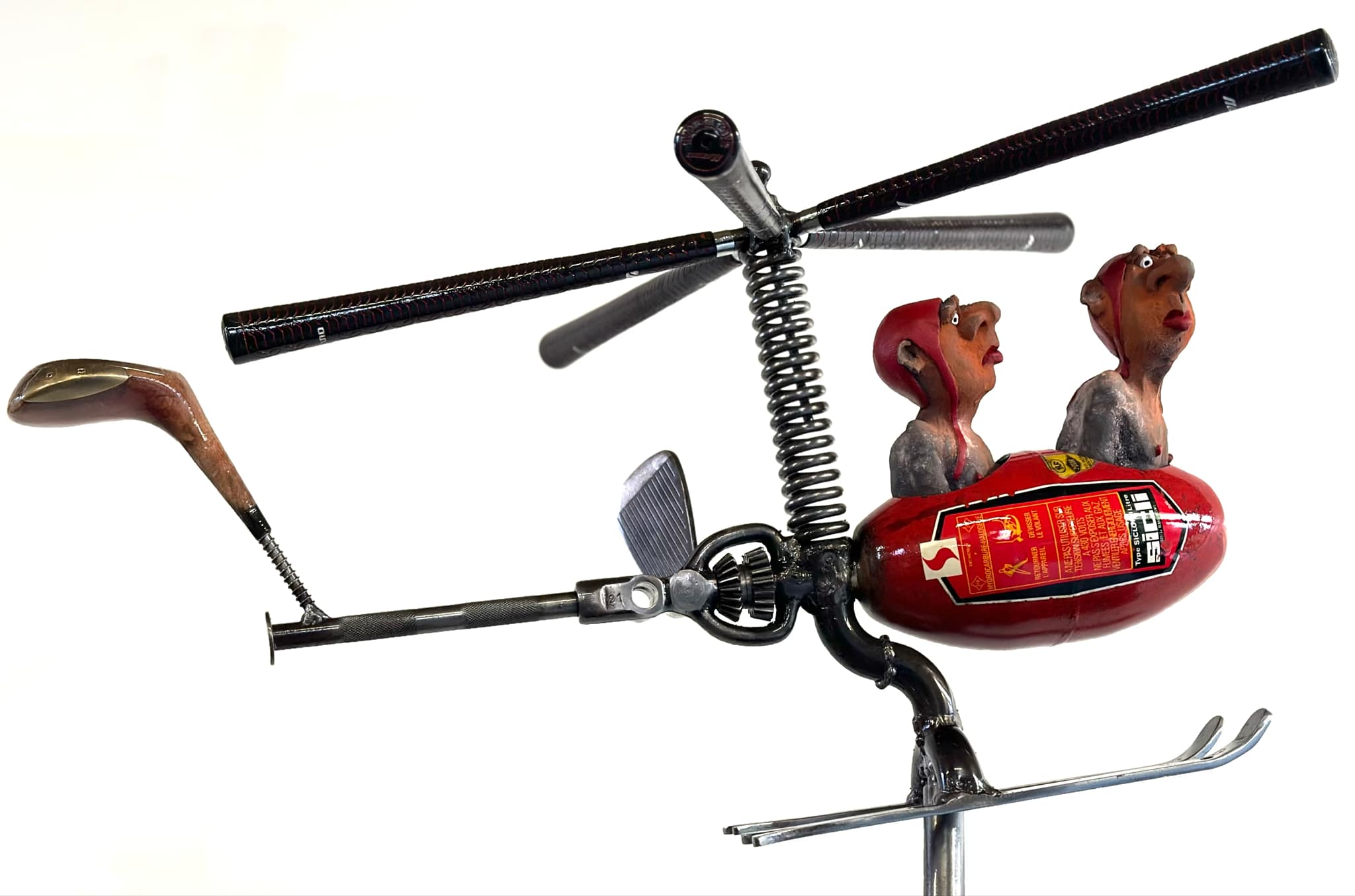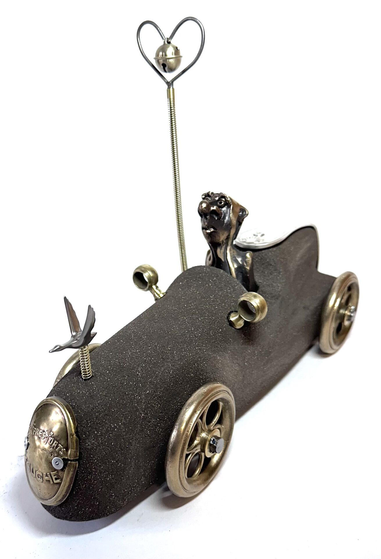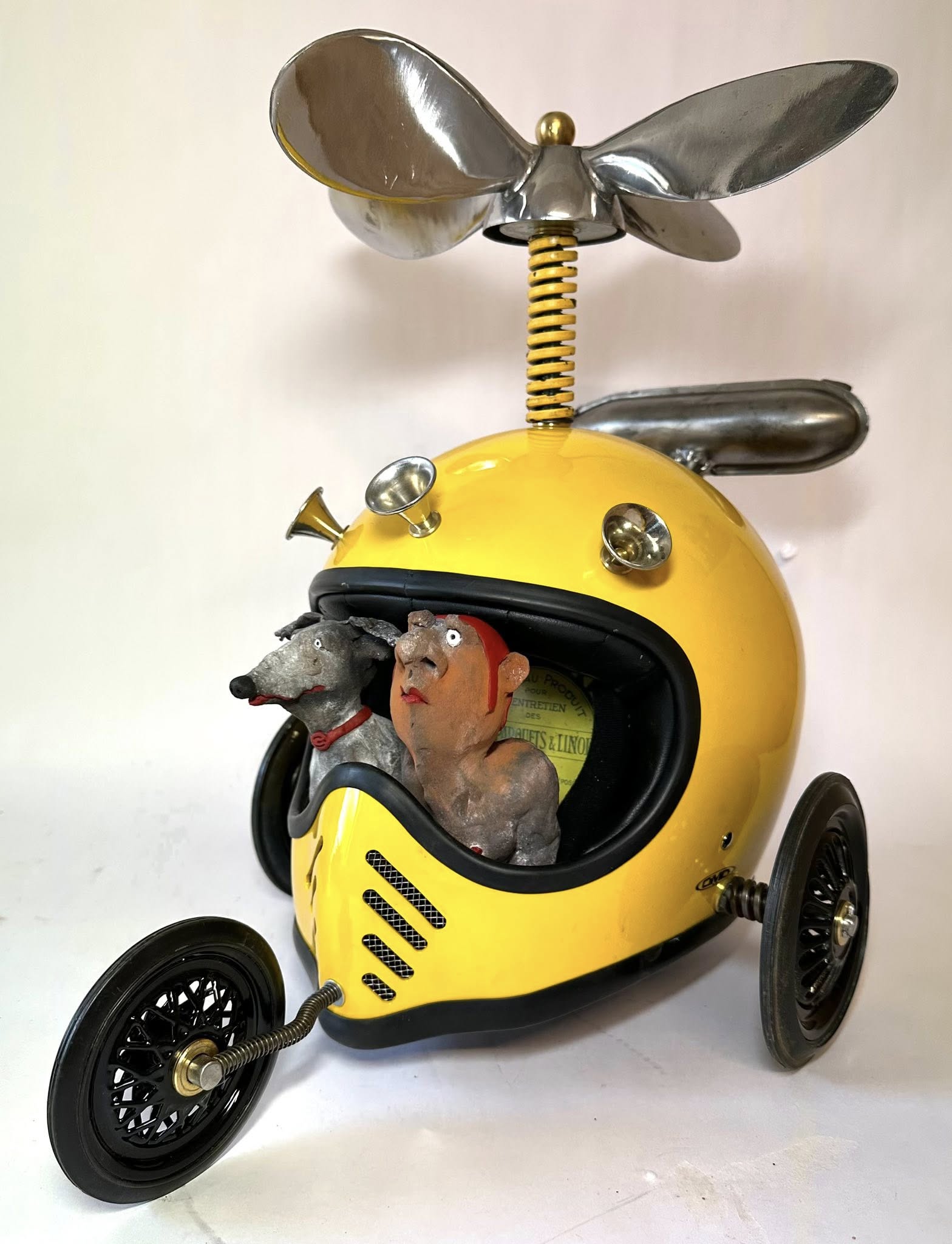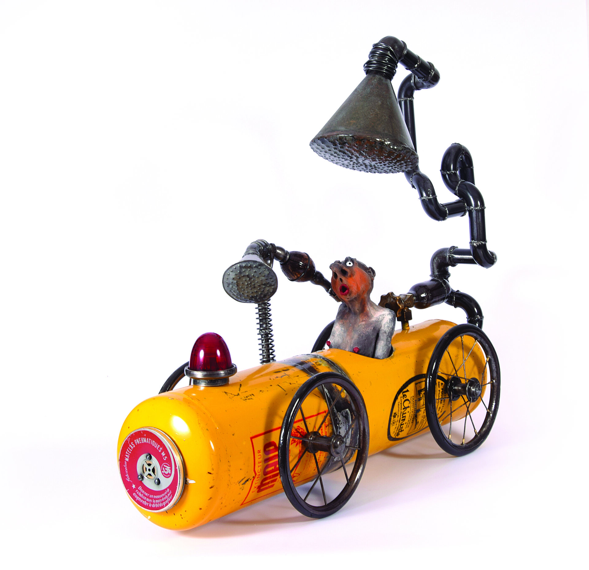 Ces hommes fragiles sculptés par Yannis Lagresle surviennent d’un monde innommable. Il n’y a pas d’artifice, la sculpture parle d’elle-même et elle est vraie. Elle est juste libre de s’exprimer, de dire…  Ces personnages prennent vie, ils les intègrent dans des objets détournés qu’il transforme, déforme, reforme…Il y a les hommes, parfois le chien et tout ce qui les fait évoluer dans un univers unique, insolite, bien à lui…