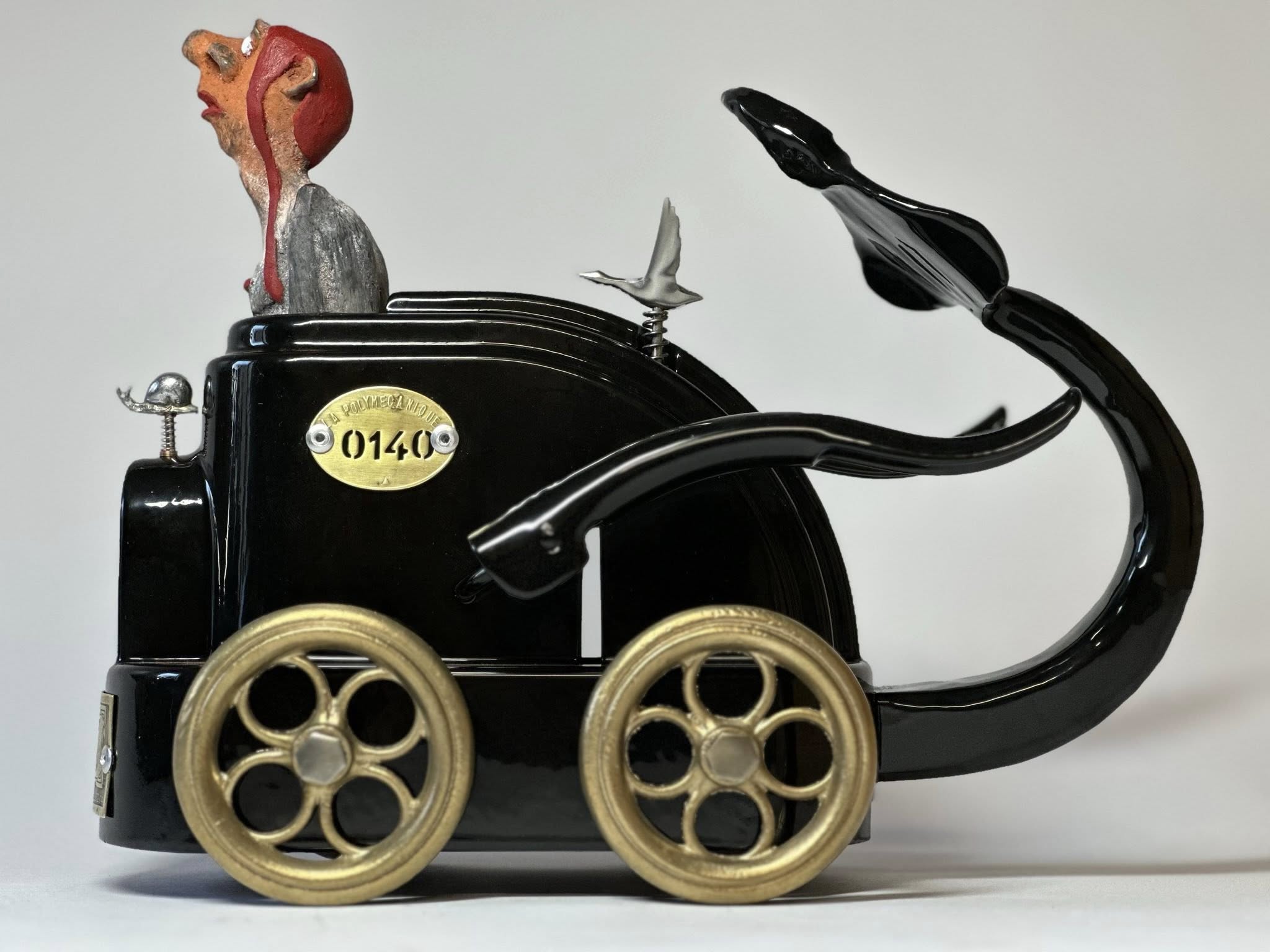 C’est sans doute un retour vers l’enfance qui le pousse vers la création des Yayas…Oui, Ses sculptures ont un vif parfum de voyage, elles sont toutes en partance. A la question : quelle destination ? il reste muet, le sait-il lui-même…En tout cas, il part chaque jour dans ce monde qui n’appartient qu’à lui. Et pourtant, il s’amuse à observer les réactions et surtout les expressions des gens de passage dans son atelier. Il les regarde sourire, rire ou penser, s’évader et commenter…et il partage…