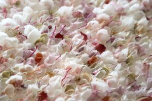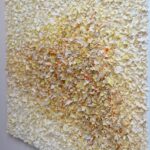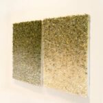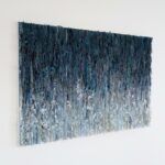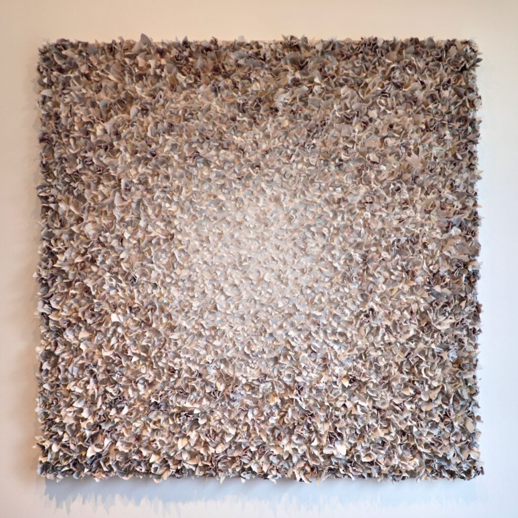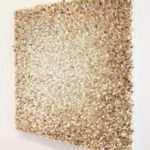 « Des dialogues déchirés sur une toile de sagesse »   :  Dans mon travail « le médium est le message », le processus complexe de déchirement et de mise en forme de chaque morceau de papier symbolise la façon dont les sources traditionnelles de connaissances, telles que les livres de poésie, les histoires et les informations culturelles, sont métaphoriquement et littéralement déchirées à l’ère numérique. Ces fragments représentent la richesse de la sagesse humaine qui servait autrefois de fondement à la compréhension interculturelle. L’œuvre met en évidence la perte tragique de profondeur et de substance dans la façon dont nous percevons, comprenons et communiquons désormais à travers les cultures.