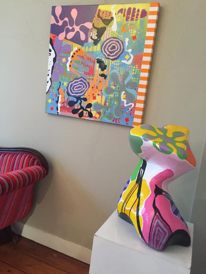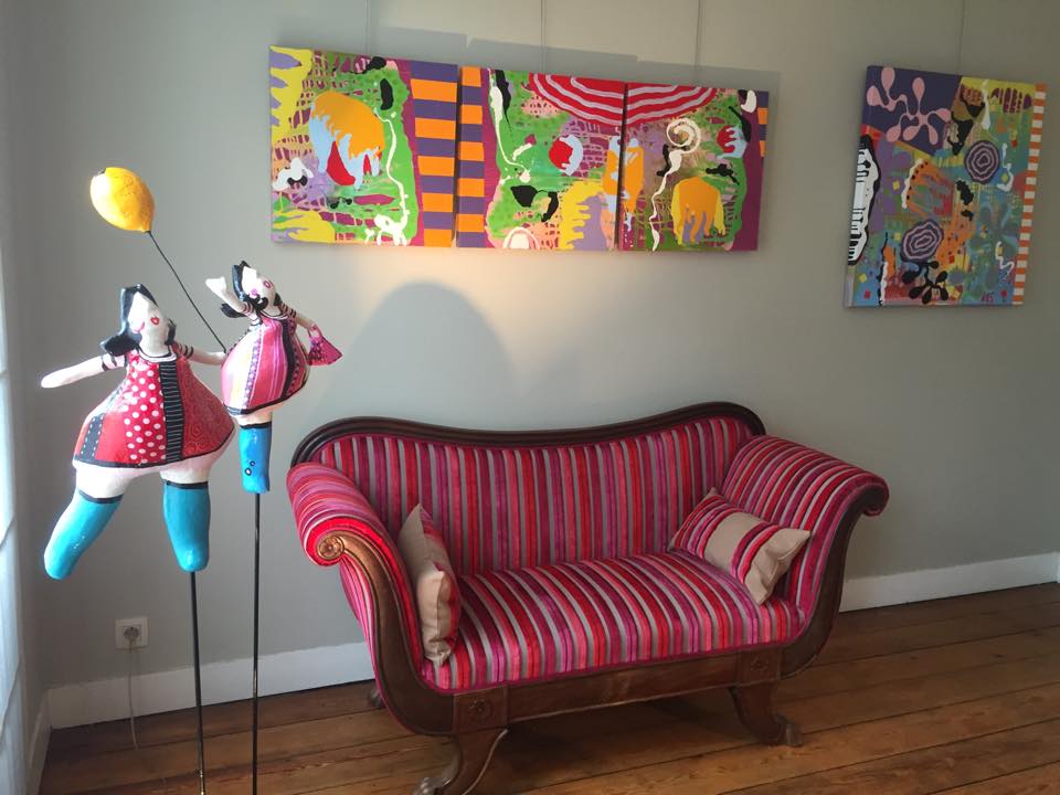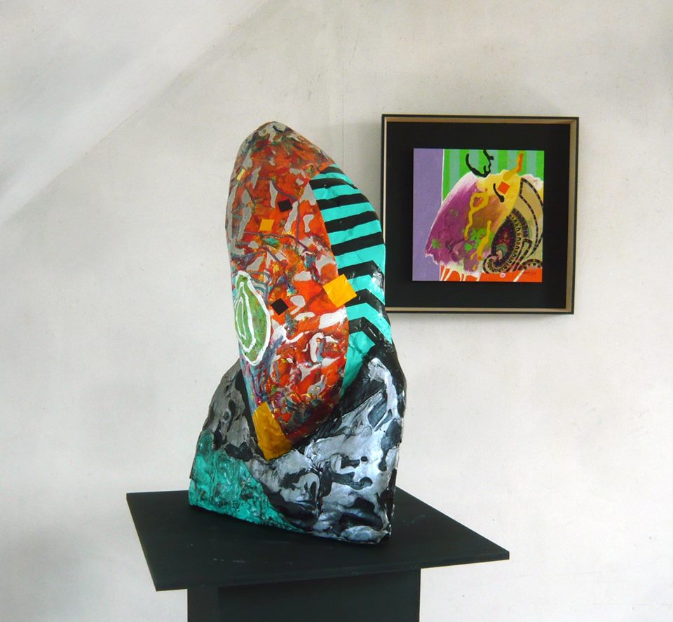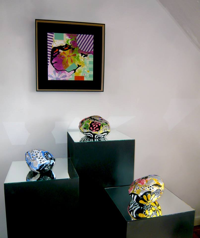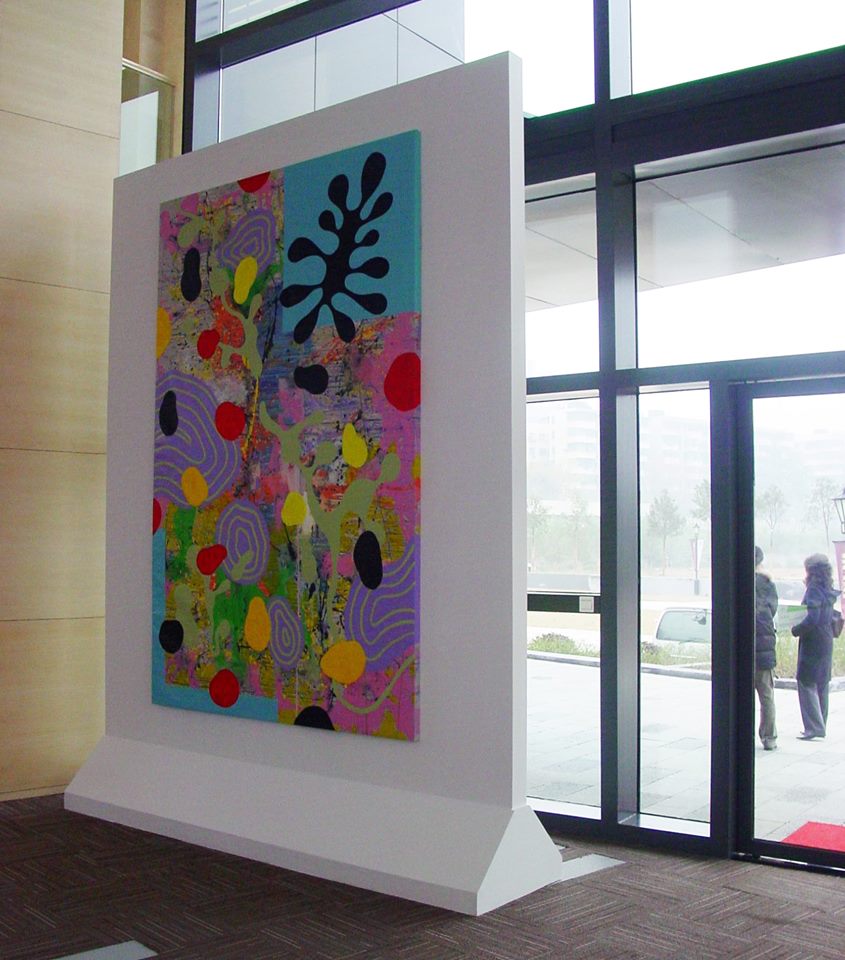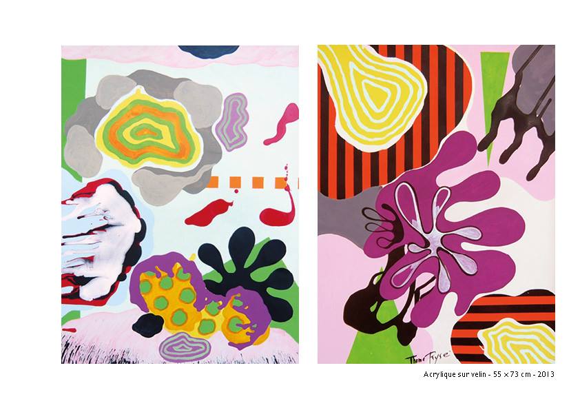 Toutes ses œuvres très chromatiques intègrent aux formes les plus libres, les plus pulsionnelles, des formes très contrôlées et réfléchies empruntées au vocabulaire géométrique comme pour nous convaincre que la réconciliation entre le sensible et le rationnel. est possible.