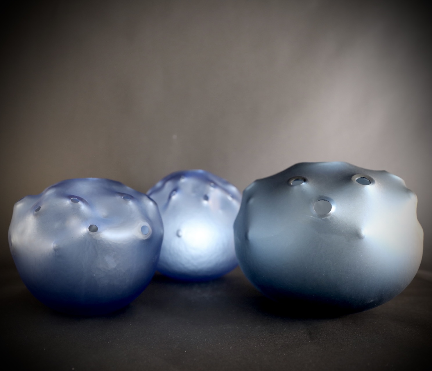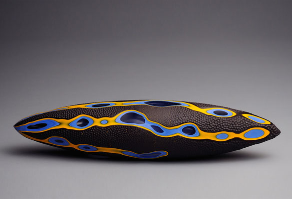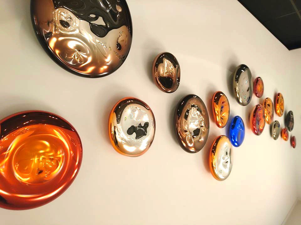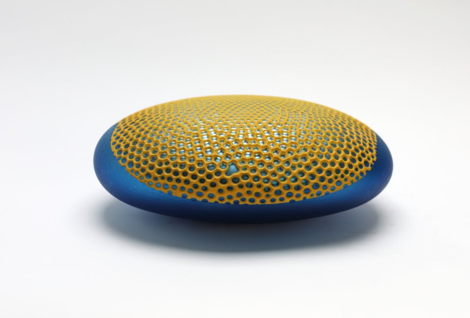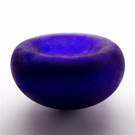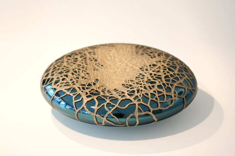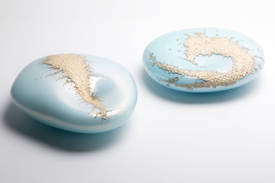 Xavier Le Normand souffle le verre et extrait de la masse brûlante des formes organiques. Une dépression centrale signe la plupart de ses œuvres. Elle concentre la lumière, l’attrape à la surface du verre. Le sculpteur taille ensuite le verre à froid. Il révèle ainsi les différentes couches colorées (overlays) ou crée un réseau de motifs répétitifs. Des paysages statiques apparaissent à la surface du verre. Xavier Le Normand joue avec la translucidité du verre souvent dissimulée aux regards. Elle ne s’observe qu’aux limites du volume : entre deux couches de verres ou à la surface d’une argenture. L’artiste confère ainsi souvent à son matériau une profonde opacité qui invite au toucher.