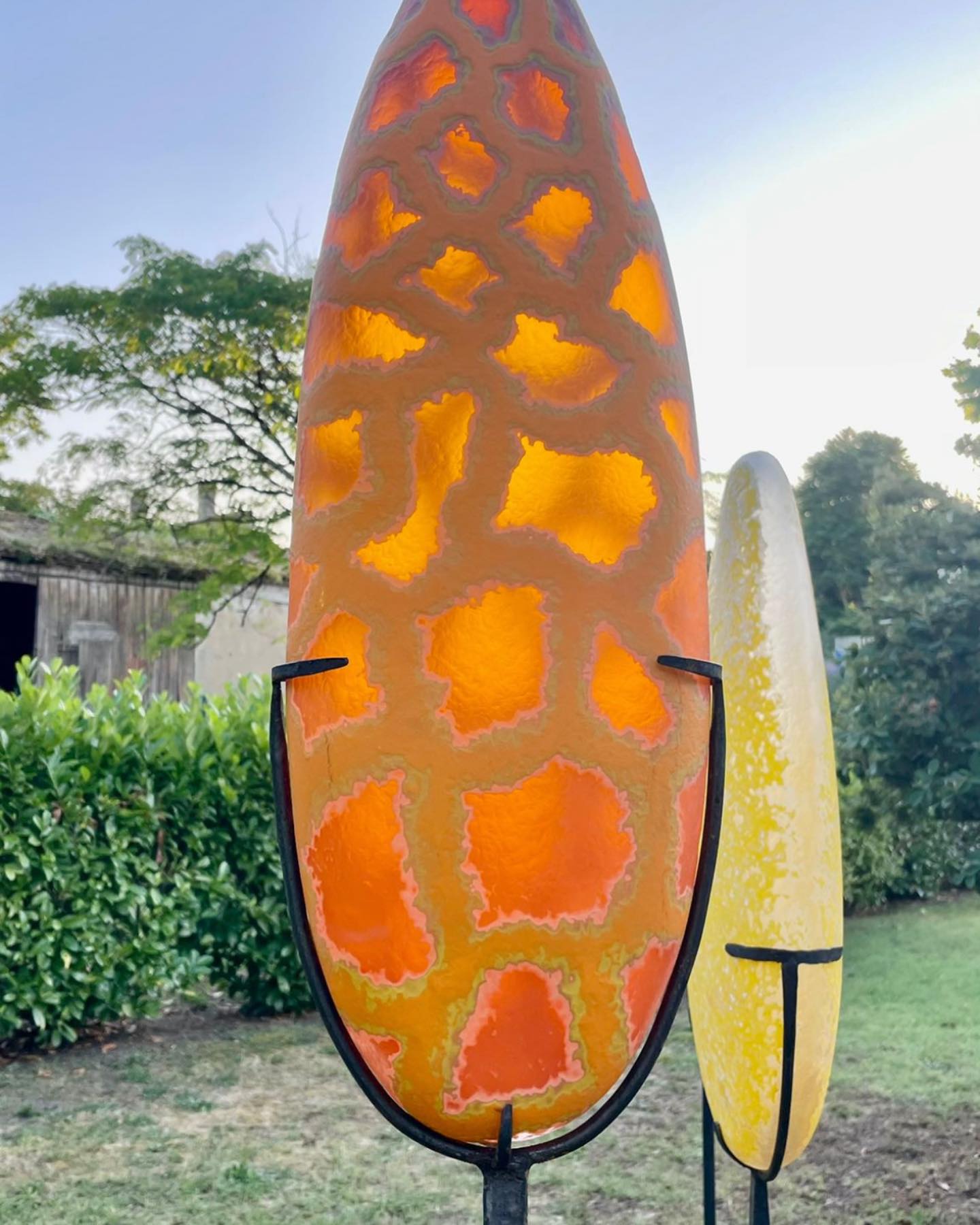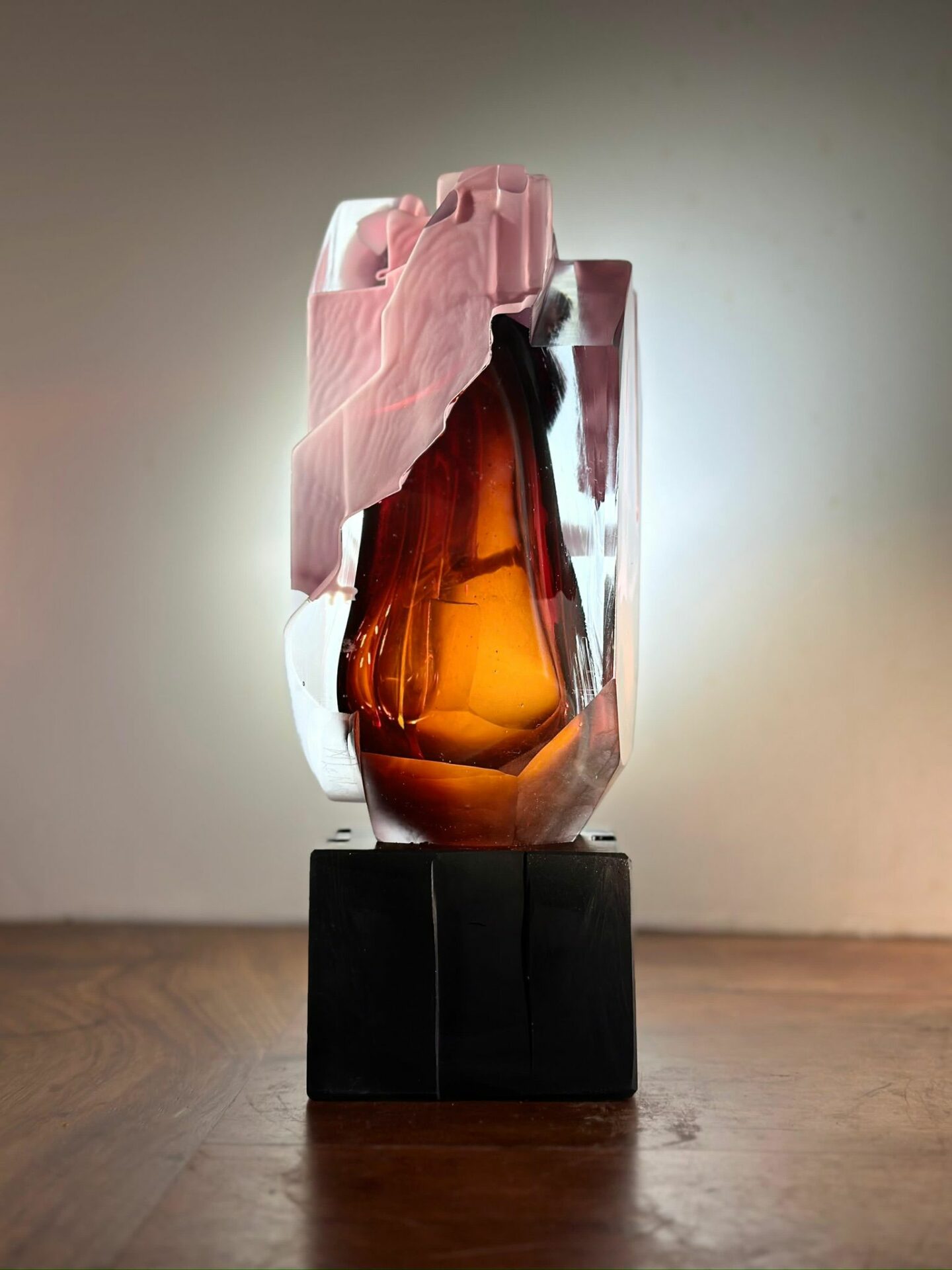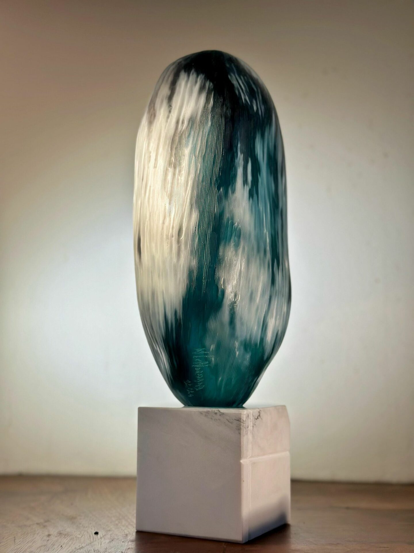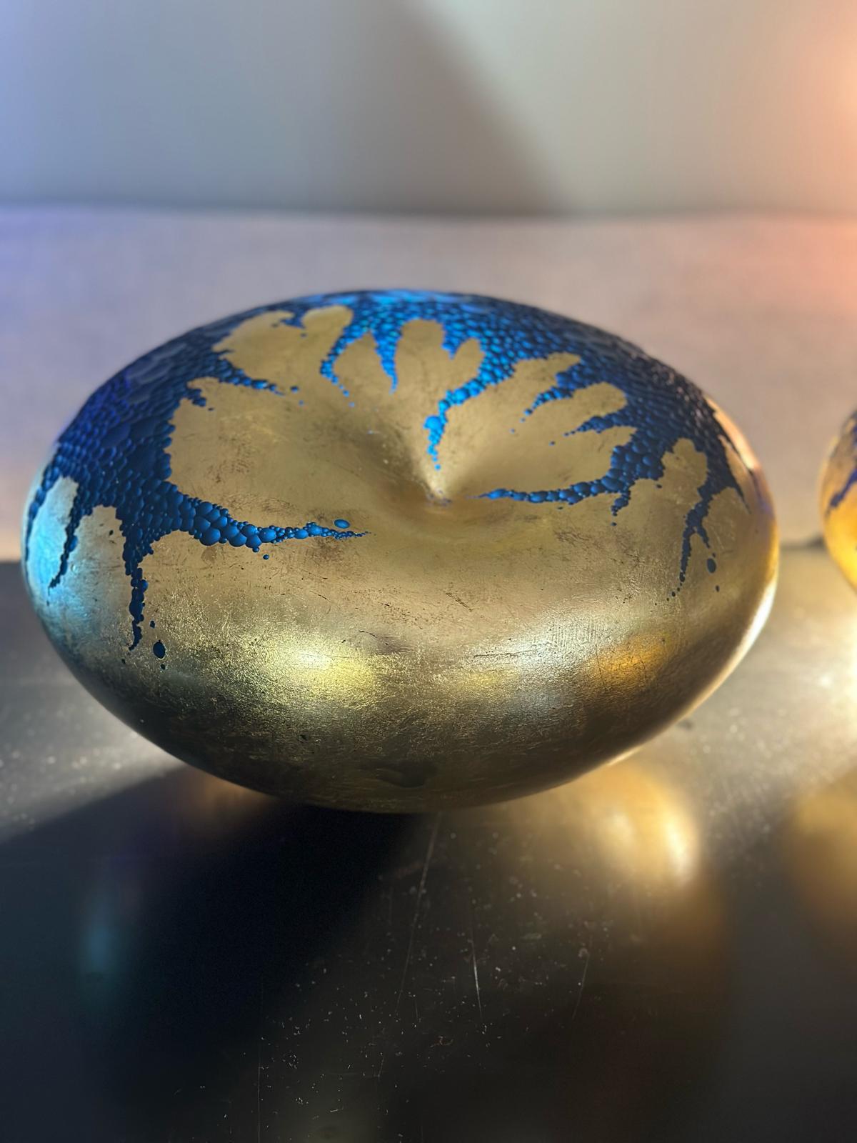 Xavier Le Normand souffle le verre et extrait de la masse brûlante des formes organiques. Une dépression centrale signe la plupart de ses œuvres. Elle concentre la lumière, l’attrape à la surface du verre. Le sculpteur taille ensuite le verre à froid. Il révèle ainsi les différentes couches colorées (overlays) ou crée un réseau de motifs répétitifs. Des paysages statiques apparaissent à la surface du verre. Xavier Le Normand joue avec la translucidité du verre souvent dissimulée aux regards. Elle ne s’observe qu’aux limites du volume : entre deux couches de verres ou à la surface d’une argenture. L’artiste confère ainsi souvent à son matériau une profonde opacité qui invite au toucher.